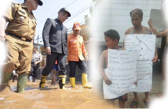 BANDUNG, FOKUSJabar.id: Warga korban banjir di Kelurahan Andir, Kecamatan Baleendah, Kabupaten Bandung, melakukan aksi turun ke jalan. Dalam aksinya, mereka menyindir Gubernur Jabar Ridwan Kamil (Emil) yang belum lama ini meresmikan Dilan Corner di Kota Bandung.
