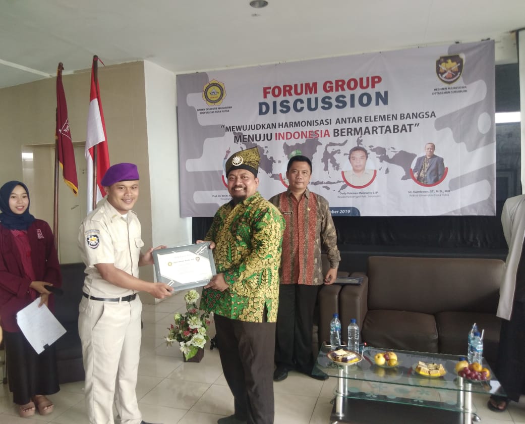 SUKABUMI,FOKUSJabar.id: Resimen Mahasiswa Mahawarman Detesemen Sukabumi bekerjasama dengan BEM Universitas Nusa Putra gelar Forum Group Discussion ( FGD ) dengan tema ” Mewujudkan Harmonisasi Antar Elemen Bangsa Menuju Indonesia Bermartabat ” di Kampus Universitas Nusa Putra Cibolang Sukabumi. Kamis (24/10/2019).